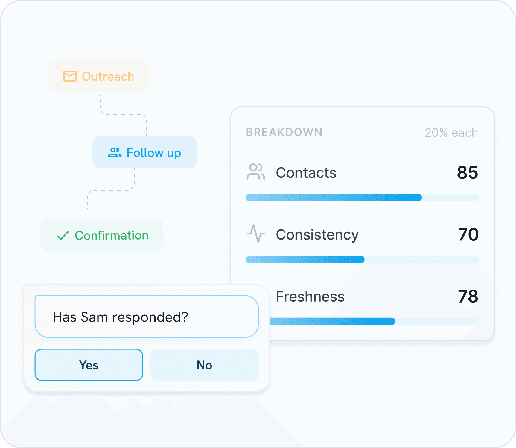Automated check-in prompts, context tracking, and relationship health scores so nothing goes cold.